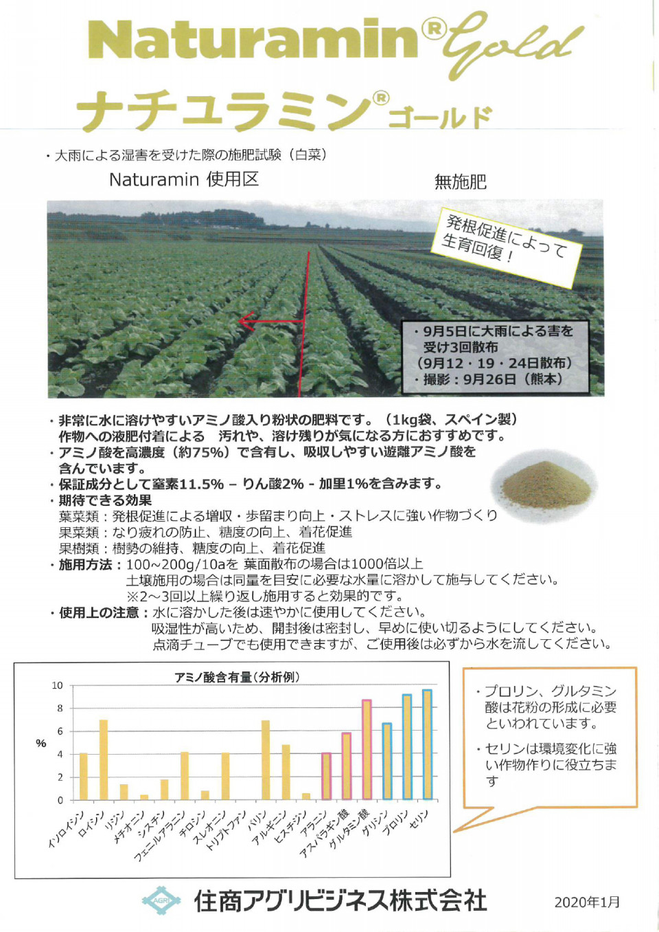 ナチュラミンゴールドは、高濃度アミノ酸を主成分とした完全水溶性の粉末液肥で、
