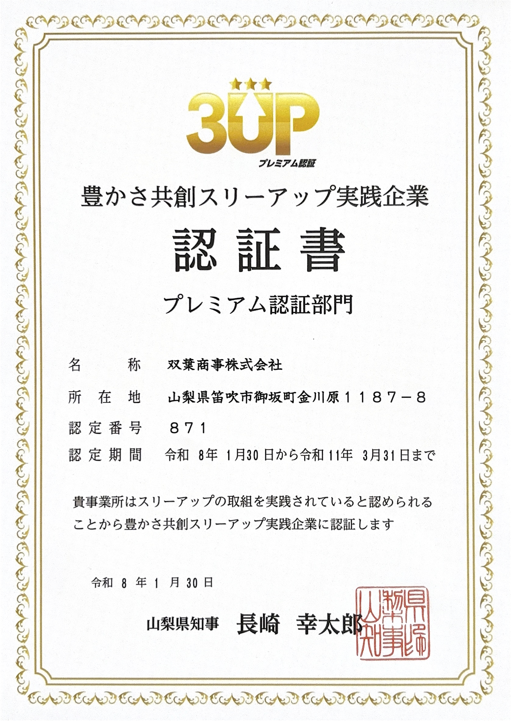 山梨県より「豊かさ共創スリーアップ実践企業(3UP)」プレミアム認証部門において認証を受けました。