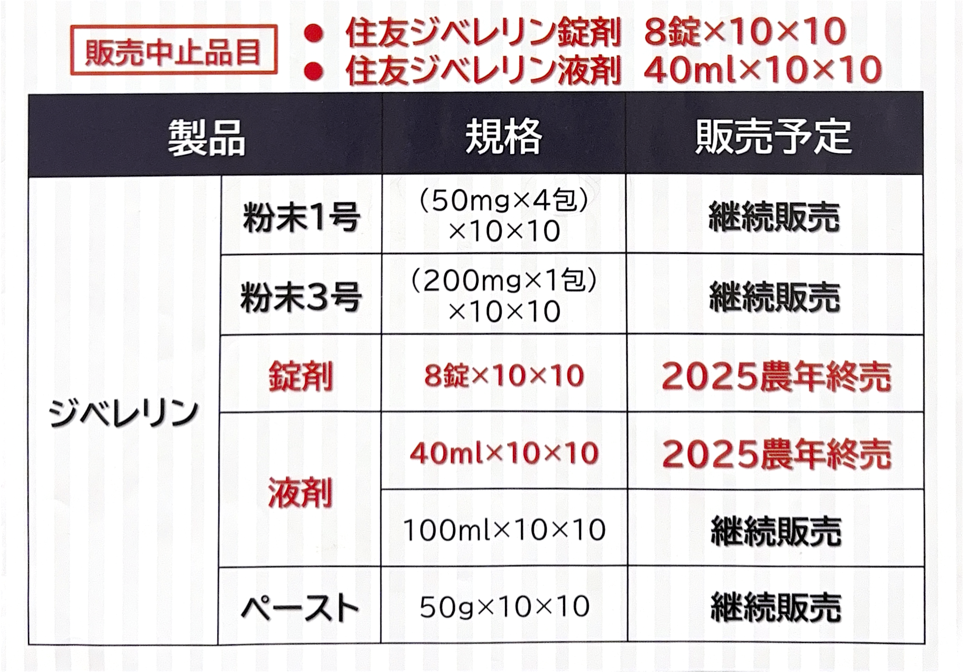 ジベレリン製品 一部品目終売および規格集約のご案内